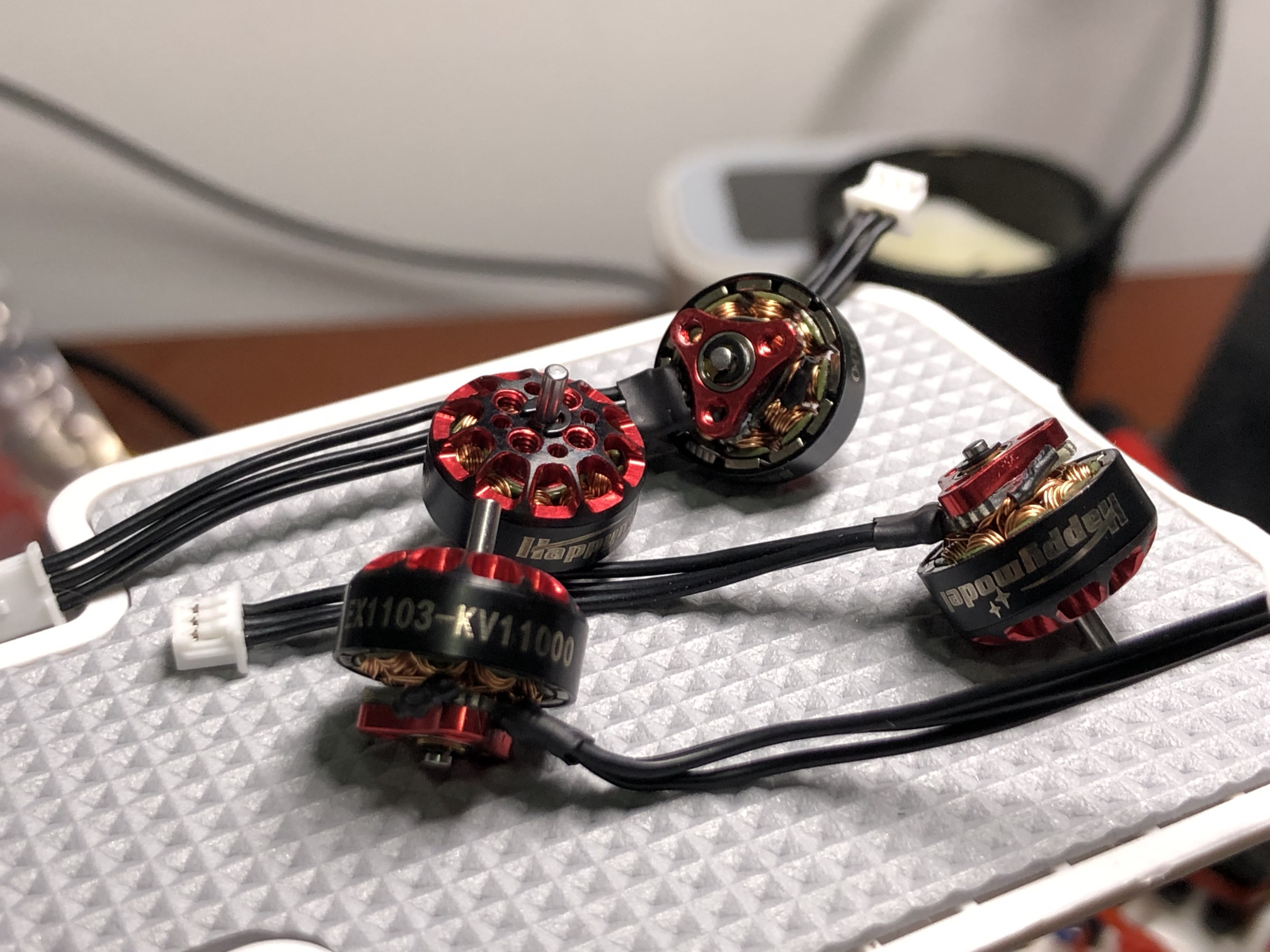 generic 1103 15000KV 2S (3 hole M1.4 base with 6mm distance, same as the betafpv 1102 motors) or better, more expensive motors like DarwinFPV bling 1103 8000KV, Happymodel EX1103 11000KV, sparkhobby xspeed 1103 8500KV