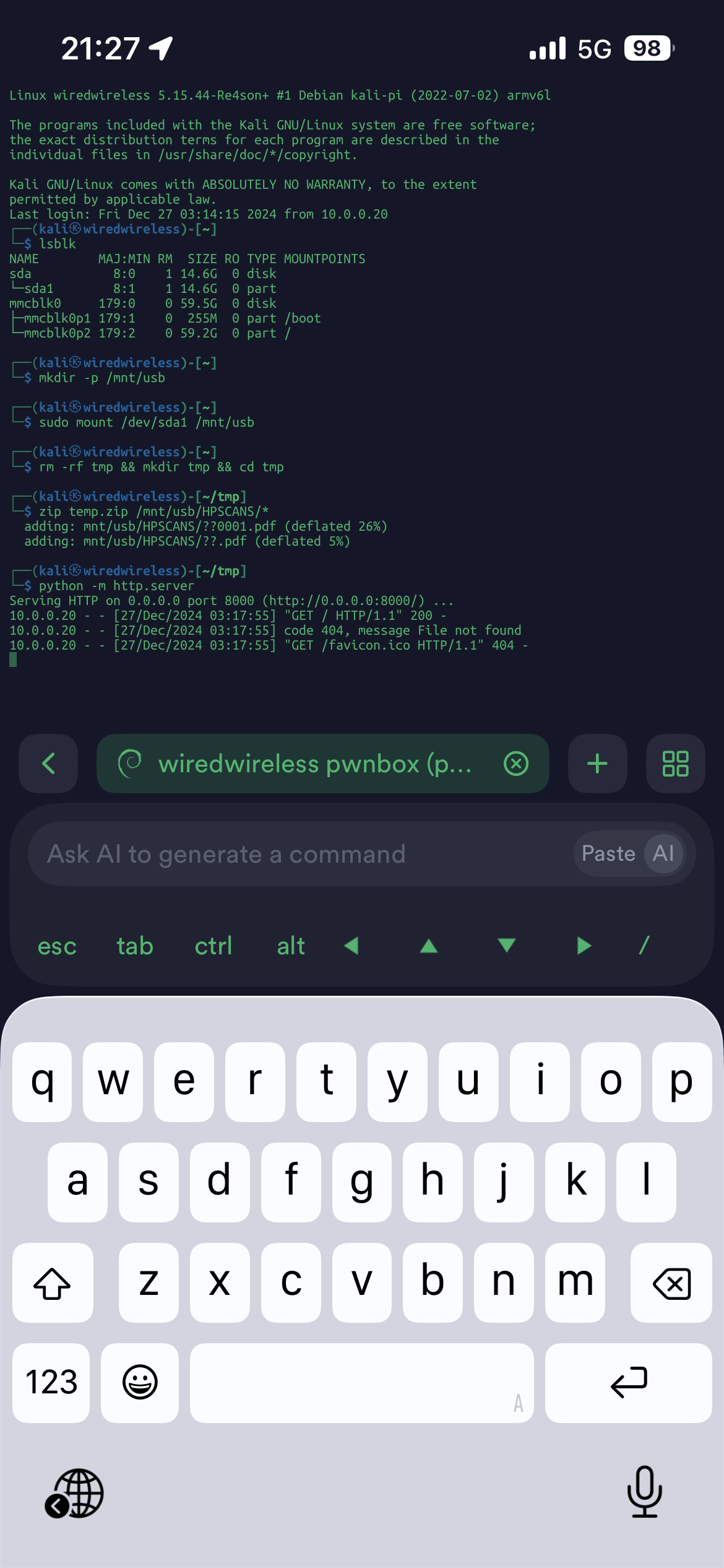 I scanned a bunch of paperwork to a pendrive and needed these pdf files on my iPhone, but the only computer I had on me was my rpi0w with a bunch of memory cards. One of them had Kali configured as a dropbox. I also had a micro USB to type C cable that I use to connect to AIO flight controllers, and a powerbank.